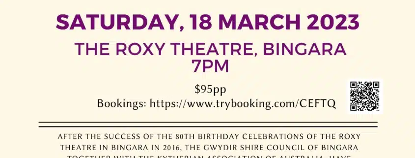 AFTER THE SUCCESS OF THE 80TH BIRTHDAY CELEBRATIONS OF THE ROXY THEATRE IN BINGARA IN 2016, THE GWYDIR SHIRE COUNCIL OF BINGARA TOGETHER WITH THE KYTHERIAN ASSOCIATION OF AUSTRALIA, HAVE ORGANISED THE BINGARA ROXY DINNER DANCE. MAKE A WEEKEND OF IT AND JOIN US ON WHAT IS GOING TO BE AN AMAZING NIGHT!