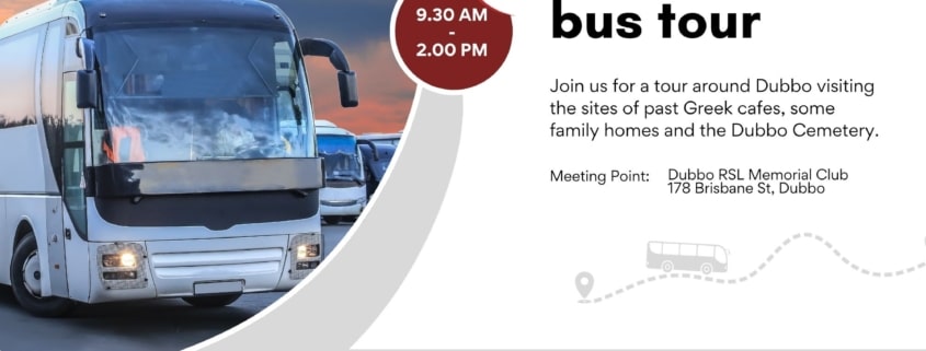 Join us for a tour around Dubbo visiting the sites of past Greek cafes, some family homes and the Dubbo Cemetery. Meeting point – Dubbo RSL Memorial Club, 178 Brisbane St, Dubbo.