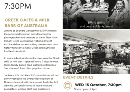 Join us as Leonard Janiszewski & EffyAlexakis the renowned historian and documentary photographer and creators of the In Their Own Image: Greek-Australians National Project Archive deliver an enthralling presentation on a history familiar to many Greek and Kytherian families in Australia.