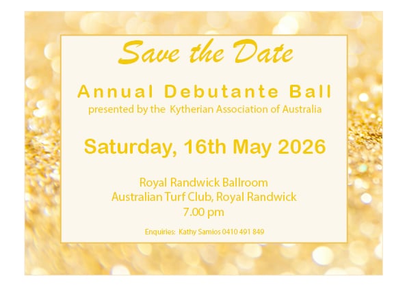 2026 Kytherian Debutante Ball Save the Date! Debutante Expression of Interest forms open 1 Sept 2025, close 1 Nov 2025. Available on our website www.kytherianassociation.com.au