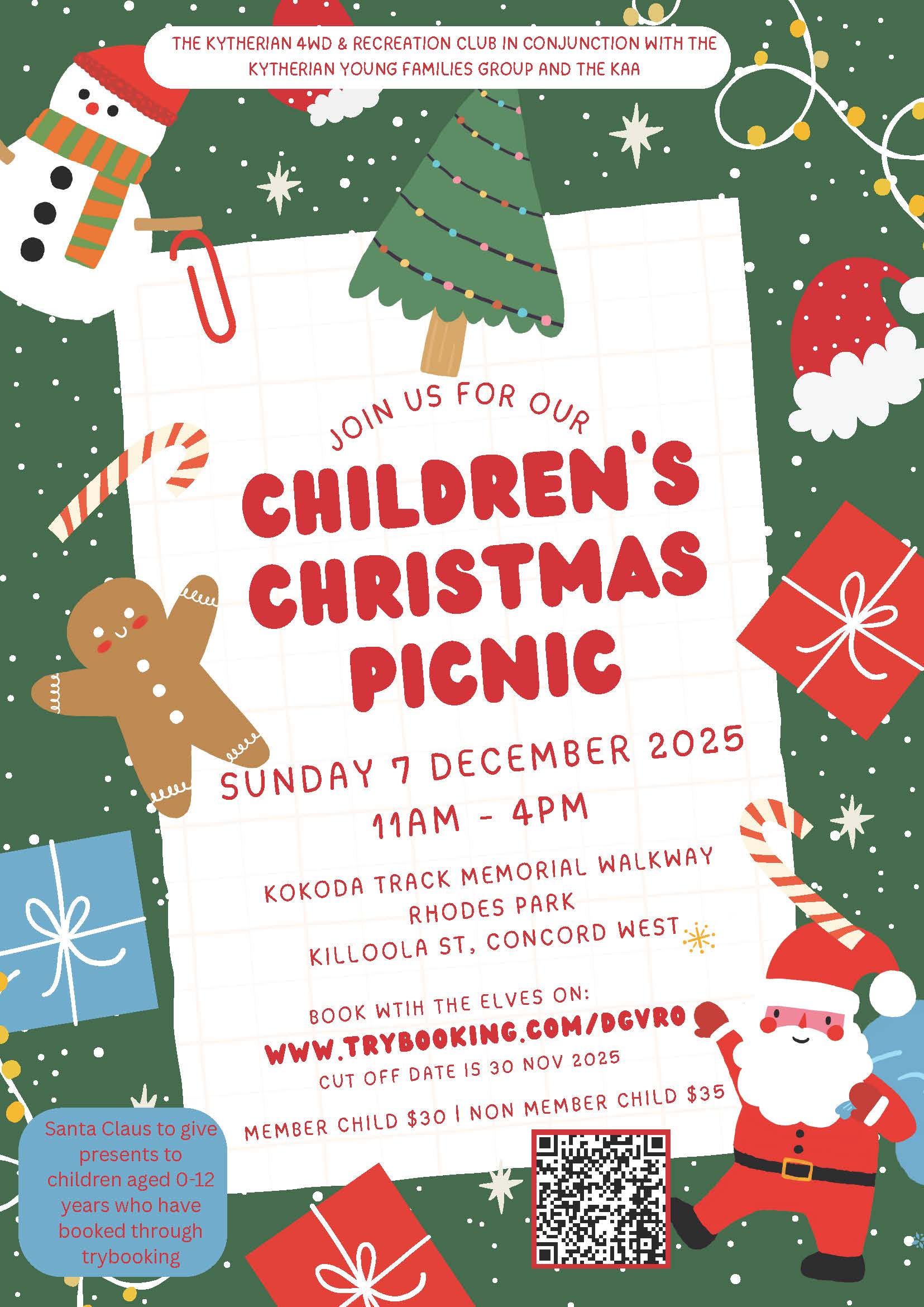 KAA Children's Christmas Picnic 7 December 2025 11am - 4pm Kokoda Track Memorial Walkway, Rhodes Park (Killoola Street, Concord West) Bookings: www.trybooking.com/DGVRO (cut off date is 30 Nov 2025) Member child $30 | Non member child $35 Santa Claus to give presents to children aged 0-12 years who have booked through trybooking.